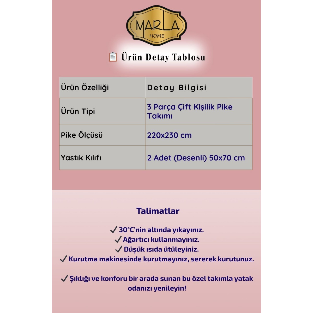 Marla Home koleksiyonu, yatak odasında hem düzen hem de işlevsellik arayanlar için tasarlandı. Standart pikelere göre çok daha cömert bir kullanım alanı sunan 220x230 cm battal boy ölçüsü, yatağınızı bütünüyle sararak dekoratif bir bütünlük oluşturur. Günlük yaşamın temposuna uyum sağlayan, hafif ve nefes alabilen yapısıyla her mevsim elinizin altında olacak pratik bir çözümdür.
